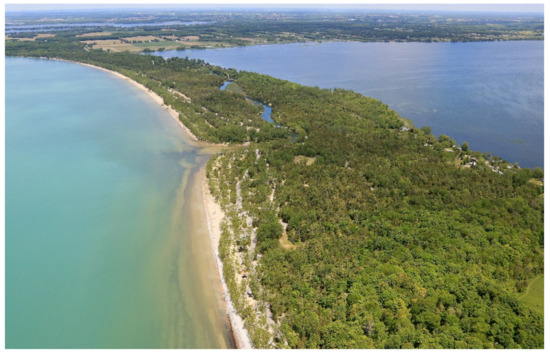 The study area is located on Lake Ontario in Prince Edward County, Ontario, Canada, in Ecodistrict 6E–15 (Picton) [28]. The site includes Sandbanks Provincial Park (in an area of 1600 ha), West Lake, East Lake, and surrounding areas (Figure 1). Both West and East Lakes have waterway connections to Lake Ontario. Sandbanks Provincial Park was introduced as “one of the most popular and highly used parks in the Ontario provincial park system” [29]. The park is famous for its coastal dune communities and associated pannes [28], “the largest freshwater baymouth barrier dune system in the world” [30]. These beach ecosites have experienced and been exposed to active shoreline processes such as storms, high waves, seasonal high-water levels, coastal erosion/accretion, ice scour, extreme moisture and temperature events, and low nutrient availability [28]. Although this region has a long history of human activities, recreational development was initially started in 1962 [28]. The dune system was naturally forested until the 1850s, and sand mining operations were in place between 1915 and 1970. Then, recreational activities were considered in 1972 when the government decided to have a particular focus on preserving and interpreting the natural and cultural values of the park [29]. Coastal erosion has been affecting the park’s natural and cultural values and could be more common due to climate change and global warming.