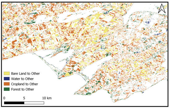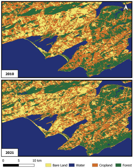 Data in Table 3 expressed a considerable decrease in the total areas of bare land (8.6%) and forests (2.7%), mainly in favor of croplands. Croplands’ expansion in the region was calculated at just over 7.3% since 2010. At the same time, areas with water coverage remained at the same level with an inappreciable increase of 0.07%.