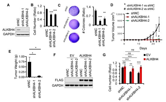 To determine the functional significance of ALKBH4 upregulation in arsenic-induced tumorigenicity in vitro and in vivo, we first performed cell proliferation and soft agar assays in As-Tr cells with or without ALKBH4 knockdown. We found that cell proliferation was significantly decreased after ALKBH4 inhibition (Figure 2A,B). In addition, ALKBH4 inhibition in As-Tr cells impaired anchorage-independent soft agar colony formation (Figure 2C). Furthermore, in vivo, we found that As-Tr cells with ALKBH4 knockdown displayed drastically reduced tumor growth (Figure 2D) and weight (Figure 2E) when injected into nude mice. Repletion with ALKBH4 rescued the effect of ALKBH4 knockdown on cell proliferation in As-Tr cells (Figure 2F,G). Notably, the overexpression of ALKBH4 in control As-Tr cells did not affect cell proliferation, suggesting that the high level of endogenous ALKBH4 expression saturated the cell proliferation capacity in As-Tr cells. Overall, these results clearly demonstrate that ALKBH4 is required for arsenic-induced malignant transformation and tumorigenicity and suggest that ALKBH4 is a tumor-promoting enzyme involved in arsenic-induced tumorigenesis.