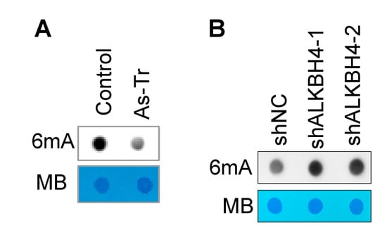 As ALKBH4 has been shown to demethylate DNA 6mA [52], we expected that arsenic-induced ALKBH4 upregulation would inhibit 6mA enrichment. Indeed, we found that DNA 6mA levels were downregulated in As-Tr cells, compared with control cells (Figure 3A). Furthermore, ALKBH4 knockdown increased DNA 6mA levels in arsenic-treated cells (Figure 3B). These results demonstrate that chronic arsenic exposure downregulates DNA 6mA methylation by upregulating ALKBH4.