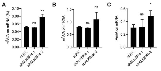 The mammalian AlkB family proteins consist of nine homologous enzymes (ALKBH1-8, FTO), which are derived from the prokaryotic DNA repair enzyme AlkB. The AlkB family depends on Fe2+ and α-ketoglutarate to catalyze the demethylation of different substrates, including double-stranded DNA, single-stranded DNA, mRNA, non-coding RNA, and proteins [60,61,62,63]. Our lab previously found that chronic arsenic exposure reduced N6-methyladenosine (m6A) mRNA methylation levels [55]. Here, we sought to determine whether ALKBH4 also regulates mRNA m6A methylation levels in As-Tr cells. To this end, we comprehensively evaluated several mRNA modifications with or without ALKBH4 inhibition in As-Tr cells using liquid chromatography–mass spectrometry. We found that ALKBH4 knockdown did not consistently affect the levels of m6A, N1-methyladenosine (m1A), or 2-O-methyladenosine (Am) (Figure 4A–C). Taken together, these findings demonstrate that while ALKBH4 regulates DNA 6mA modification, it does not affect m6A, m1A, or Am mRNA modifications in arsenic-transformed cells.