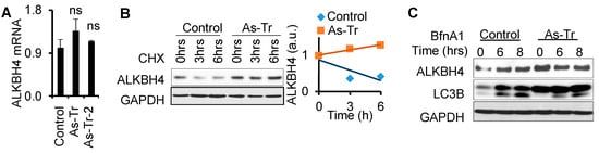 ALKBH4 stability is upregulated by arsenic via autophagy inhibition: (A) qPCR analysis of ALKBH4 mRNA levels in control and As-Tr cells; (B) immunoblot analysis of ALKBH4 in control and As-Tr cells treated with cycloheximide (CHX, 100 μg/mL) over a time course; (C) immunoblot analysis of ALKBH4 following treatment with BfnA1 (50 nM) for 6 and 8 h in control and As-Tr cells. ns, not significant (A); compared with the control group; Student’s t-test.