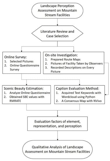 There are limited studies using visual language translation or the CEM in Taiwan; however, hydraulic engineers need a reference for aesthetic design to meet the landscape requirements. This study uses the CEM as a qualitative research analysis tool for the landscape evaluation of mountain stream facilities. Selecting award-winning projects as the research objects, case studies are conducted to evaluate their design styles and compare them with other types of mountain stream facilities. Meanwhile, the quantitative analysis, using methods such as SBE, is compared with the qualitative results. Finally, qualitative analysis is used to explore the correlations among the characterization factors, perception factors, and preferences. The research goal is to establish a foundation for subsequent aesthetic engineering design in the future. The entire research process is shown in Figure 1.