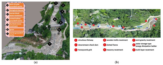 On-site investigation map: (a) Upstream Renovation Project of Toubiankeng Stream in Zhongpu; and (b) Renovation Project of Sijiaolin Stream (source: Soil and Water Conservation Bureau, Taiwan).