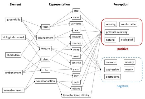 The subjects’ feedback information, especially the self-selected shooting pictures, provides rich information and multiple materials. For example, subjects with different backgrounds observe from different perspectives. The ones with an engineering background are accustomed to observing engineering structures, so they describe the form and functions. The students without an engineering background more easily observe from the perspective of life, noticing things such as insects and vegetation in the surrounding environment along with the sound of flowing water, bugs chirping, and birds singing in the background, in their perception of the environment. Referring to the concept of the Zaltman metaphor elicitation technique (ZMET) [,,], using the text keywords extracted by this study and NVivo, a consensus map of the respondents is produced, as shown in Figure 5. Furthermore, the factors are organized from the above analyses, as shown in Table 7.