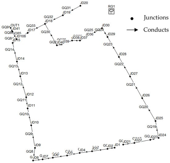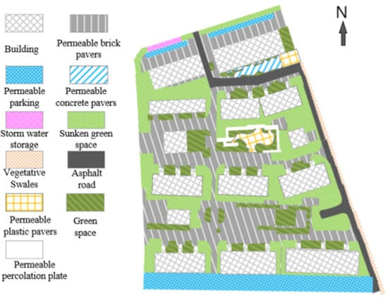 The study area was selected at a residential community being built in Changchun, Jilin Province, China, covering a total area of 39,027.38 m2, with a relatively flat topography slightly leaning from south to north. The study area has a temperate continental semi-humid monsoon climate with a long and cold winter. According to the Chinese weather network, the multi-year monthly average temperature in Changchun from November to March is below 0 °C and the annual average temperature is 4.6 °C. The coldest month is January, with a monthly average temperature of −15.1 °C. The hottest month is July, which has an average temperature of 23.1 °C. The annual precipitation is 600–700 mm, while rainfall mainly occurs in June, July, and August, which accounts for more than 60% of the annual precipitation. On 16 July 2017, two heavy rainstorms fell within 24 h in Changchun, causing severe waterlogging on many roads and posing a serious threat to transportation facilities and infrastructure; the heavy rainfall on 2 June 2021 resulted in 52 waterlogged spots within Changchun. Meanwhile, the Chinese Central Environmental Protection Inspectorate inspected Changchun in September 2021 and attributed the local combined sewer overflows accompanied with the problems of the smelly and black water bodies to the overdue retrofitting work for converting the combined sewer system into the separate sewer system.
