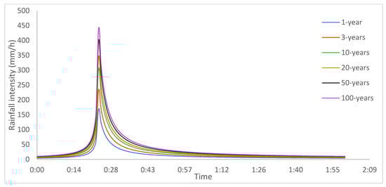 The precipitation data used in this study included the design storms and the historical time series. According to the rain intensity equation developed for Changchun [31] and the ‘Chicago method’ [32], the design storms of 1, 3, 10, 20, 50, and 100 years were derived, respectively, with a rainfall peak coefficient of 0.2 and a rainfall duration of 120 min (Figure 3). The rain intensity equation was derived from the measured data from 1983 to 2012 [31]: