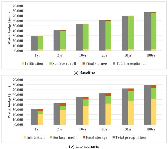 The runoff-reduction effect of LID tended to drop with the increase in the recurrence of the design storms. In the baseline, the surface runoff took approximately 85–94% of the total water budget, while infiltration accounted for 5–12% of the total water budget (Figure 5). The runoff coefficients of the baseline ranged between 0.86 and 0.95 (Table 6). In the LID scenario, the infiltration volume rose to between 66% and 70% of the water budget, while the ratio of the surface runoff volume dropped to only 15–30%. The runoff coefficients were also significantly reduced to the range of 0.15–0.28. Along with the increase in the recurrence period, the runoff reduction effects of LID tended to fall, though still ranging from 70% to 82% (Table 6).
