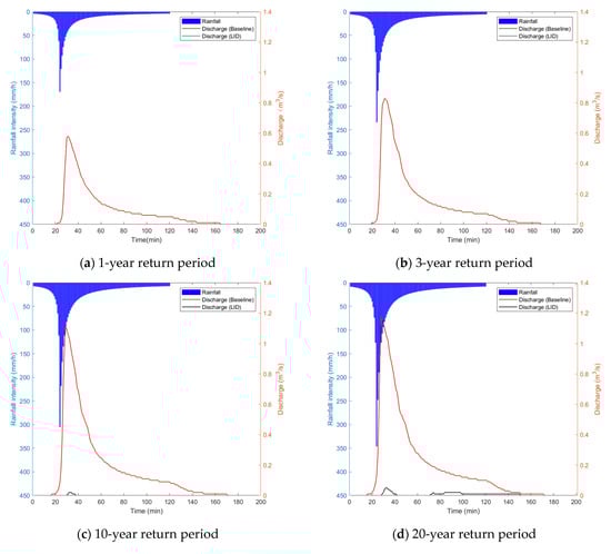 The inverse relationship between the runoff-reduction effect of the LID and the recurrence period could also be shown from the outlet hydrographs. In the baseline, hydrographs of the last conduit of the sewer system indicate that the flood peak closely followed the rain peak with a 4–7 min time lag, and the peak flow increased from 0.58 m3/s to 1.24 m3/s with the recurrence (Figure 6 and Table 7). In the LID scenario, under the condition of a 1-yr storm event, no flow occurred and the flow reduction rate became 100%. Since the 3-year storm event, the flow reduction rates had dropped to 87.9–96.4%, though the peak flow was only 0.03–0.15 m3/s and the peaks appeared 27–77 min later than the rain peaks. It can be inferred that with the increase in rainfall, the effect of runoff reduction turned weaker as the storage of the LID became saturated.