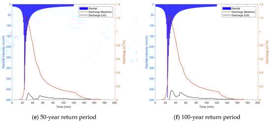 Hydrographs of the conduit at the outlet in the 1-yr (a), 3-yr (b), 10-yr (c), 20-yr (d), 50-yr (e), and 100-yr (f) design storms.