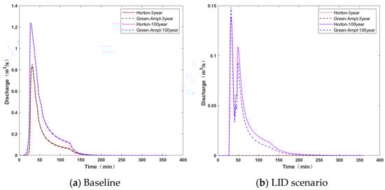 Hydrographs of the outlet in 3-yr and 100-yr design storms, simulated by the different infiltration methods in the baseline (a) and LID scenario (b).