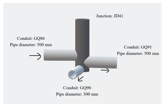 Due to the low percentage of the pervious area of the sub-catchment in the baseline, the selection of the infiltration method appeared to have negligible effect on the outflow discharge (Figure 7). After adding the LID, however, the choice of the infiltration method resulted in slightly different hydrographs. The hydrograph exhibited two peaks with the 100-year design storm setting. The two peaks were due to the presence of a bifurcation above the outlet of the catchment (Figure 8). The upstream 500 mm pipeline was connected to the downstream municipal mainline, while the third pipe on the side with a 300 mm diameter connected at the bottom of the manhole would first lead the flow to a stormwater storage module [35]. So, the first peaks of the hydrographs were mainly contributed by the incoming runoff from the upstream, and the magnitudes between the two infiltration methods were close.