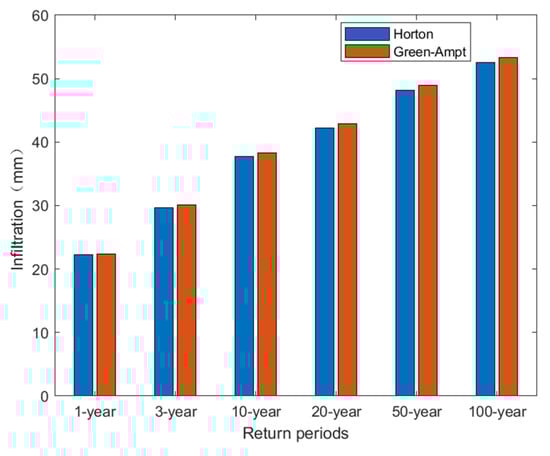 Two infiltration methods led to distinct outflows of the catchment. In the baseline, the peak flow at the outlet reached 0.83 m3/s and 1.2 m3/s for the 3-year and 100-year rainfall, respectively. In the LID scenario, however, no flow was observed during the 3-year storm event; during the 100-year storm event, the peak flow was only 0.15 m3/s, and the outflow volume was 283.5 m3, simulated by the Horton method, which was 17.4% higher than that with the Green–Ampt method. This was because the infiltration depth of the Green–Ampt method was larger than that of the Horton method (Figure 9). Such a difference in the outflow, however, could be hardly revealed simply from the direct comparison between the surface runoff simulated by the two infiltration methods.