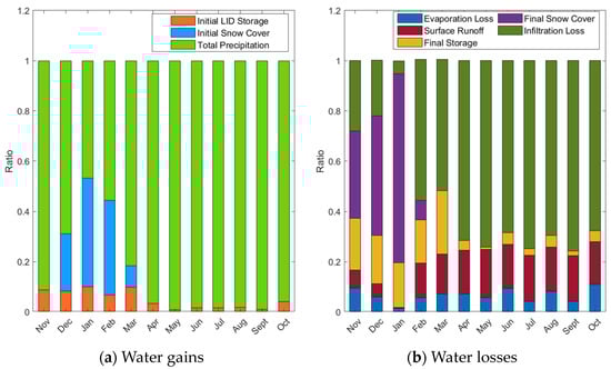 Monthly water gains (a) and losses (b) in the LID scenario.