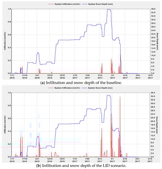 To better study the effects of snowmelt in a cold climate on urban runoff, the precipitation data from November 2016 to April 2017 were extracted and utilized for separate snowfall simulations. In the baseline, the summer infiltration accounted for 72.7% of the total water loss, and surface runoff took up 18.2% (Figure 10). In the LID scenario, the winter infiltration accounted for 64.3% of the total loss, and surface runoff accounted for 16.7% of the total loss (Table 9). The lower ratios of infiltration and runoff in the winter indicate that the snow covers created extra storage, which held snowfall from becoming infiltration and runoff. Noticeably, the water budget ratios of the winter were not far from those of the summer, so the LID could effectively manage surface runoff in both winter and summer, possibly owing to the presence of frequent freezing-thawing cycles [38,39].