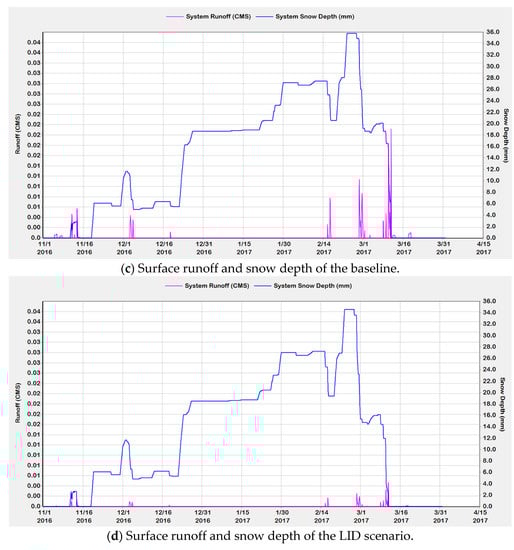 The outflow of the snowmelt runoff from the outlet had a different dynamic from that of the summer rainfall-runoff process. Unlike summer, winter snowfall did not melt immediately to form surface runoff or infiltration, but continued to accumulate at the surface (Figure 11). So, the LID did not provide the immediate regulation of surface runoff in winter like in summer, but resumed functioning in the late winter. However, LID still managed to significantly reduce the peak outflow down to lower than 0.004 m3/s from November 2016 to March 2017. It, therefore, can be argued that the LID contributed to relieving the pressure of the storm drains in the face of the spring runoff, as well as increasing the groundwater recharge for the dry regions [40,41].