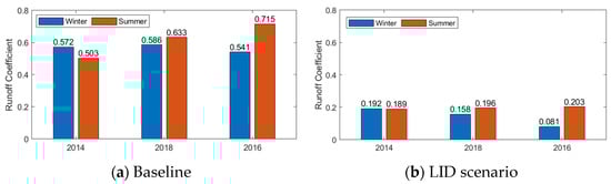The seasonal runoff coefficients were calculated based on the observed precipitation events (Figure 12). Winter snowfall was 52.3 mm, 53.4 mm, and 47.8 mm in the dry (2014), average (2018), and wet (2016) years, respectively, accounting for 11.7%, 7.9%, and 6% of the total annual precipitation; correspondingly, the winter snowmelt runoff accounted for 11.9%, 7.2%, and 4.5% of the total water budget, respectively. In the LID scenario, the summer runoff coefficient in 2014 was almost equal to that of winter when the summer rainfall was 7.5 times greater than the winter snowfall (Table 10). Due to the seasonal snow covers with low or zero permeability in winter, the hydrologic performance of LID was compromised and became less effective in reducing runoff than in summer.