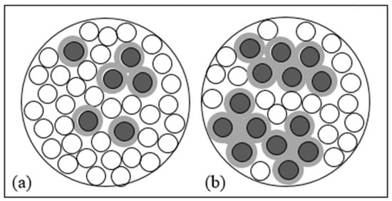 Schematic representation of a cross-section area of a granular reactive mixture composed of ZVI particles (grey circles) including iron corrosion products (light grey circles) and admixing agent particles (white circles), considering a minor (a), or major (b) ZVI content per unit volume.