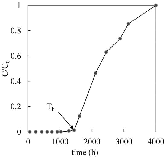 where n is the number of sampling ports where the breakthrough is observed and Li is the reactive medium thickness (distance of the i-th sampling from column inlet) where the breakthrough is observed and Tbi is the breakthrough time at the i-th sampling port. The breakthrough time, for each sampling port, is identified as the time where a rapid increase of the relative contaminant concentration (C/C0 with C concentration at time t and C0 initial concentration) above the Italian regulatory limits (equal to 1 mg/L for copper, 0.02 mg/L for nickel and 3 mg/L for zinc) is clearly observed, as shown, for example, in Figure 2.
