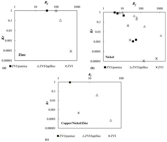 In Figure 3, the curves Kr vs. Rf are shown for the reactive media permeated with solutions contaminated by zinc (Figure 3a) or nickel (Figure 3b) in single metal solutions or copper, nickel, and zinc in pluri-contaminated solutions (Figure 3c). For the pluri-contaminated solutions, the lowest value of the retardation factor calculated for each of the three contaminants, respectively, was used. The removal sequence observed in the three tests was Cu > Zn > Ni, only in one particular case did the removal sequence for the mixture ZVI/pumice change to Cu > Ni > Zn []. The values of the two performance factors are summarized in Table 2. From Figure 3 (or Table 2) it can be observed that with the increase in the retardation factor, the hydraulic conductivity of the system decreased.