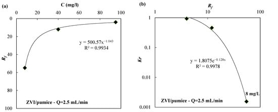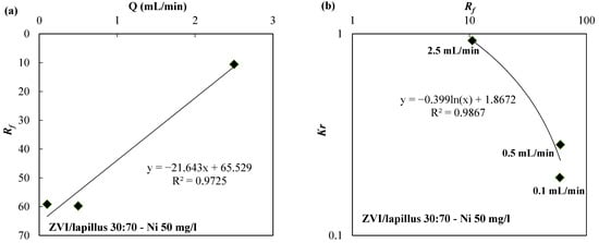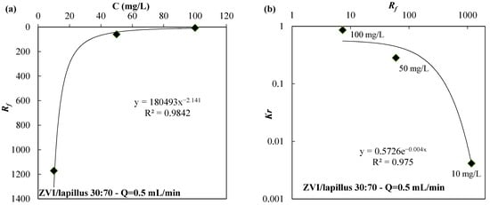In Figure 4a and Figure 5a, the Rf values are shown as a function of the initial concentration of nickel in column tests carried out using the ZVI/pumice mixture (weigh ratio 30:70) and a flow rate of 2.5 mL/min (Figure 4a) or the ZVI/lapillus mixture (weigh ratio 30:70) and a flow velocity of 0.5 mL/min (Figure 5a). The laws that link the Rf with the initial concentration of the contaminant are shown in Figure 4a and Figure 5a for the ZVI/pumice mixture (Q = 2.5 mL/min) and for the ZVI/lapillus mixture (Q = 0.5 mL/min), respectively. The laws that link Kr with Rf are shown in Figure 4b and Figure 5b for the ZVI/pumice (Q = 2.5 mL/min) and the ZVI/lapillus mixture (Q = 0.5 mL/min), respectively. The optimal correlation was confirmed by correlation coefficient values (R2) greater than 0.97.