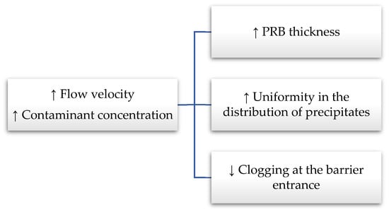 Figure 7 summarizes, in a flow chart, the effect generally observed in the increase in flow velocity or contaminant concentration on the hydraulic and the reactive behavior of a granular mixture composed of ZVI (setting the ZVI content per unit volume). When the mass of contaminant flowing through the reactive medium is accelerated by the flow rate (the residence time is reduced) or the contaminant concentration increases, the thickness of the reactive medium necessary to reach the regulatory limit also increases.