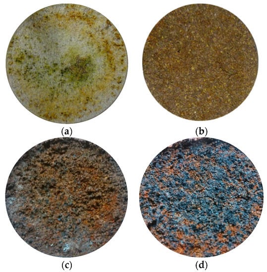 Photos of the inlet section of the column at the end of the column tests for different test conditions. (a) ZVI/pumice (w.r. 30:70) Ni 95 mg/L Q = 2.5 mL/min Kr = 0.932. (b) ZVI/lapillus (w.r. 30:70) Ni 100 mg/L Q = 0.5 mL/min Kr = 0.857. (c) ZVI/lapillus (w.r. 50:50) Zn 50 mg/L Q = 0.5 mL/min Kr = 0.107. (d) ZVI/lapillus (w.r. 30:70) Ni 10 mg/L Q = 0.5 mL/min Kr = 0.0041.