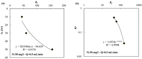 (a) % ZVI vs. Rf and (b) Kr vs. Rf for the ZVI/lapillus granular mixture permeated with a solution of nickel 50 mg/L at a flow rate equal to 0.5 mL/min.