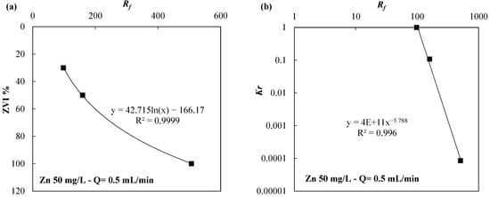 (a) ZVI % vs. Rf and (b) Kr vs. Rf for the ZVI/lapillus granular mixture permeated with a solution of zinc 50 mg/L at a flow rate equal to 0.5 mL/min.