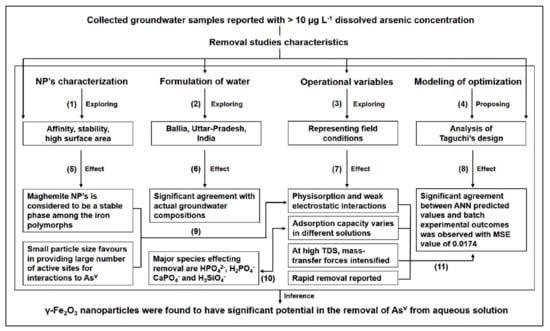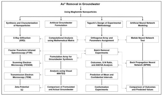 Analyzing interactions among the experimental variables and result outcomes is impractical through one-way classification procedures [72,73] because it requires many experimental runs. Additionally, these explain only the effects of design factors on the average result level. Nevertheless, the experimental design based on mathematical models is relevant and helps to assess the statistical significance of different factors [74,75]. These effectively investigate the effect of multiple factors and potential interactions among the factors through minimum numbers of experimental runs. Therefore, we opted to use Taguchi’s experimental methodology in the present study. Previously, several authors explored the response surface methodology (RSM) to optimize the removal of contaminants, such as fluoride [76], heavy metals [77], and anionic dye [78] using MNPs. However, Taguchi’s optimization methodology has not been reported for AsV removal using these nanoparticles in the literature. Taguchi’s design also considers the study of variations, which is more critical than just the average considered in RSM [79]. It also investigates different parameters affecting process performance characteristics. A brief outline of the components explored in this study is presented in Figure 1.