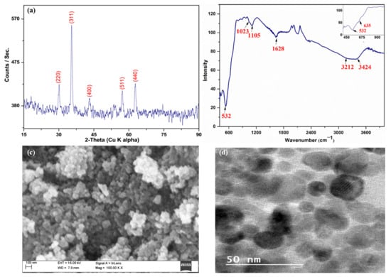 The MNPs were developed using a previously reported co-precipitation method [80], with a slight modification by refluxing the Fe2+ (ferrous) and Fe3+ (ferric) salts. First, 4.2 g of FeSO4·7H2O and 3.7 g of FeCl3 were dissolved in 100 mL of ultra-pure water and poured into a twin round bottom flask. Then, the solution was heated to 90 °C. Afterward, 10 mL of NH4OH (25%) was added dropwise. The solution was refluxed at a temperature above 90 °C for approximately 45 min and eventually cooled to room temperature. The magnetic precipitates were isolated from the alkaline solution using laboratory magnets and washed to remove all the unwanted non-magnetic and soluble products. Finally, the collected black powders were dried in an anaerobic environment (vacuum oven) for several hours at 60 °C and stored at room temperature. Then, the obtained powdered sample was employed for electronic characterization and adsorption experiments.