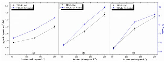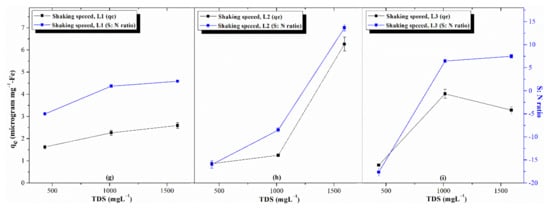 The explored experimental data was organized with higher-is-better quality characteristics (i) to identify the optimum removal conditions, (ii) along with the potential of an individual factor affecting the adsorption process, and (iii) to estimate the performance (qe) under optimized conditions. This methodology defines the loss function as a quantity directly related to the deviation from nominal quality attributes. Taguchi identified a quadratic relationship as a practical, viable function that depends on the Taylor Expansion Series, expressed as Equation (2):