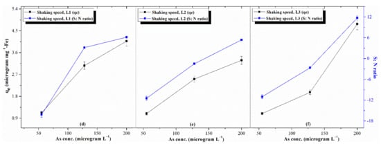 Batch adsorption studies were explored to remove AsV using MNPs for the selected 27 experimental trials having seven process factors with three levels (Table 3). The results were obtained from individual sets in terms of the total amount (qe) of AsV adsorbed (µg L−1) onto the surface of nanoparticles, as shown in Table 4. Each set of experimental trials was performed in three replications and designated as R1, R2, and R3.