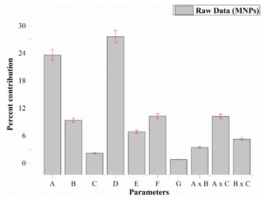 This attribute of the methodology combines the two characteristics of a distribution into a single metric. The high value of the S:N ratio signifies that the signal is higher than the noise component’s random effects and depicts the optimum value of removal characteristics MNPs. The Signal to noise ratio, S:N, was calculated from replicate experiments according to Equation (3):