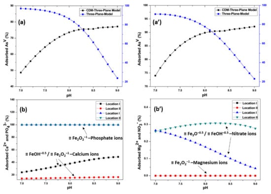 Surface complexation models (SCMs) were applied to simulate the result outcomes of the batch experiments. The geochemical code Visual MINTEQ was used to calculate adsorption reactions constant and to model AsV adsorption [91]. The charge distribution multi-sites complexation (CD-MUSIC) model [92], together with the 2pk-Three-Plane-Model (TPM), was explored to understand the adsorption behavior of AsV as a function of pH. The capacitance values inner (C1) and outer (C2) of Stern layers 1 and 2 were 1.0 and 0.2 F m−2, as derived by Garcell et al. [93] for MNPs. The zeta-potential measurements help to identify the surface moieties of MNPs that established a negative charge in the explored pH range. Therefore, the amphoteric species for singly and triply coordinated molecular surface moieties were taken into consideration for SCMs modeling, as mentioned below in Equations (8) and (9):