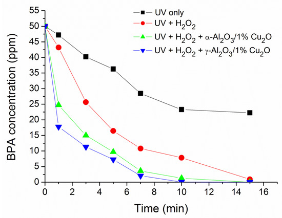 | Time (min) | Photolysis (UV Only) | UV + H2O2 | UV + H2O2 + 1% Cu2O/α-Al2O3 | UV + H2O2 + 1% Cu2O/γ-Al2O3 |