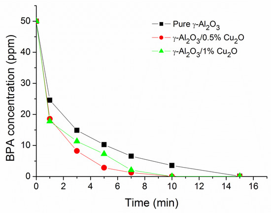 | Time (min) | Pure γ-Al2O3 | 0.5% Cu2O/γ-Al2O3 | 1% Cu2O/γ-Al2O3 |