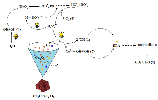 Olea-Mejia, O.; Brewer, S.; Donkor, K.; Amado-Piña, D.; Natividad, R. Photo-Fenton Catalyzed by Cu2O/Al2O3: Bisphenol (BPA) Mineralization Driven by UV and Visible Light. Water 2022, 14, 3626. https://doi.org/10.3390/w14223626