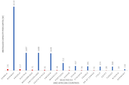 Looking at the energy situation in Africa shown in Figure 2, we can clearly see that energy production is insufficient and the countries of the African continent struggle with the problem of energy poverty. Comparing the installed capacity per capita in African and European countries, it can be seen that this is an order of magnitude difference to the disadvantage of Africa. There are significant shortages in terms of energy production. According to the World Bank’s Global Tracking Framework report, 7 of the 10 countries with the most limited access to electricity are in Africa [42]. In addition to the issue of energy poverty, the aspect of providing food is important. Water and energy resources also translate into food resources. Since the Bonn conference in 2011, particular attention has been paid to the linkages and feedback that exist between the water, energy and food sectors. It was also noted that global population, economic growth and climate change will lead to increased demand for energy, water and food [43].
