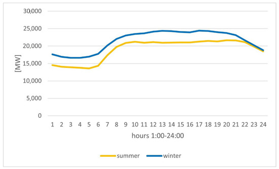 In Poland, the potential of using water for energy purposes is significantly lower than in other countries. This is due to the climatic conditions, average rainfall, and topography. The most profitable use of rivers in Poland would be cascade power plants producing peak energy when energy demand is greatest (i.e., morning and afternoon/evening hours). The daily energy demand in Poland in 2022 in the summer and winter periods is shown in Figure 3.