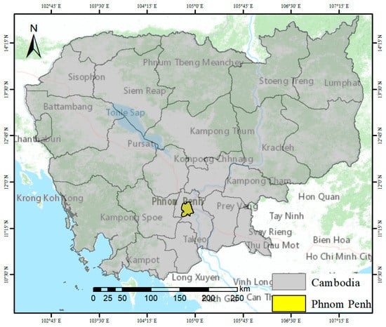 Cambodia is situated in southwest Indochina. Cambodia plays a very significant role because of its unique geographic advantages. The largest city in Cambodia is Phnom Penh, which serves as the national capital and is also an economic, cultural, transportation, trade, and religious center (Figure 2). There are 2.1 million people living in Phnom Penh, which covers a 678.46 km2 area [47]. Buddhism (Hinayana sect) is the state religion, with more than 85% of the country’s population practicing it, along with Catholicism and Islam. From ancient times to the present, monasteries have been centers not only for religious activities but also for local education and libraries, and religion has played an important role in social life [48]. The tropical climate of Phnom Penh has two distinct seasons: the “rainy season”, which lasts from March to October, is hot and humid; while the “dry season”, which lasts from November to April, has low temperatures of around 22 °C. The typical annual average temperature ranges from 28 to 34 °C [49].