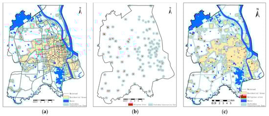 Buffer zone: (a) Buffer zone without religious POI; (b) Religious POI buffer zone; (c) Total forbidden construction zone.