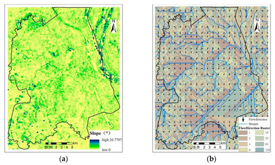 DEM: (a) Slope analysis; (b) Flow grid.