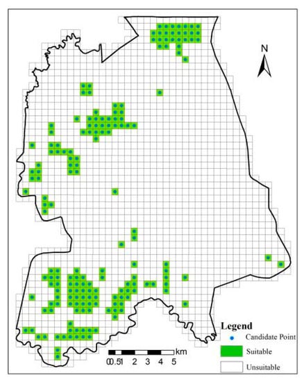 where v denotes the v-th suitability indicator, is the weight of the v-th indicator, and sv is the suitability of the v-th indicator. The grid center points in the suitability map are regarded as candidate points.