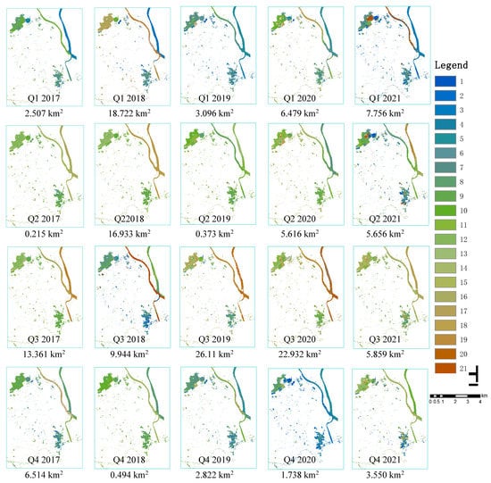 The surface water of Phnom Penh is mainly located in the northwestern and eastern areas with a total area of 45.64 km2. Cloud-free Sentinel-2 RS images have been selected from quarterly data for 2017–2021 to calculate the FUI in order to assess the degree of eutrophication of any water body during each quarter. The following table shows the spatial distribution of water quality and the degree of eutrophication of the water bodies (Figure 7).