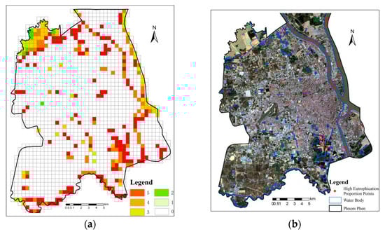 (a) Reclassified eutrophication occurrence frequency map; (b) High eutrophication frequency grids.