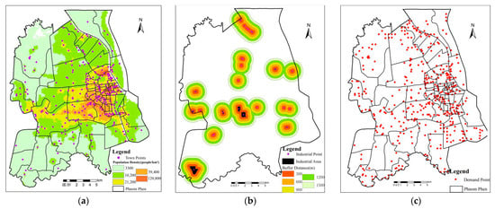 Demands distribution: (a) Population density map; (b) Industrial zone buffer map; (c) Total demand points.