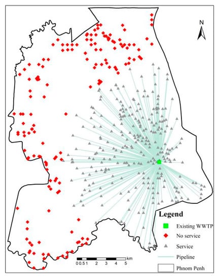 A medium-scale WWTP has been built in Phnom Penh City, which serves about 1.63 million people [54] and has a service radius of about 10 km (Figure 11). Of the 450 demand points, the existing WWTP serves 292 of them, with an effective service rate of 64.89%. However, the demand points in the northeast and west of the study area are not served, indicating there are still regions that need new WWTPs.