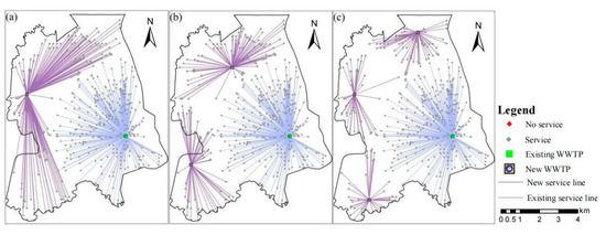 We calculate the minimum number of plants of the three different scales using the minimized facilities number model to satisfy the demands. Next, the maximum coverage model is used to calculate the locations according to the known number of WWTPs and the location of the existing WWTP. The results are shown in Figure 12.