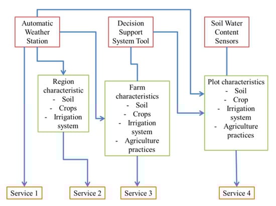 To estimate the crop IWR, the MABIA decision support software [,,] would be used to compute the irrigation requirement, based on the dual crop coefficient (Kc) method proposed by the Food and Agriculture Organization’s (FAO) Irrigation and Drainage Paper No. 56 (FAO-56). The MABIA approach has been largely used for water irrigation evaluation and management [,,], as well as for assessment studies on the impact of climate change on water resources [,,]. Figure 1 shows the organization chart of the proposed services, according to the required equipment.